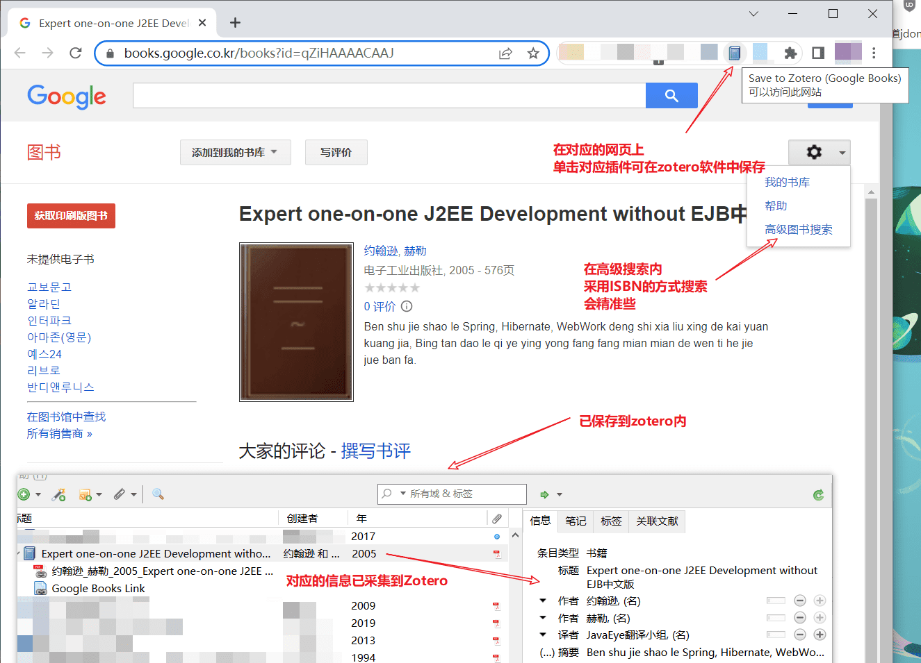 采用Zotero Connector 插件获取和新建书籍条目;书籍信息源:豆瓣(国内书籍)谷歌图书搜索 (外文书籍)