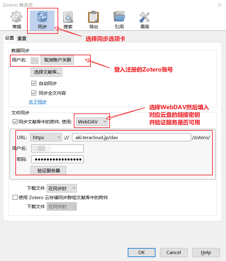 同步设置:登录和设置WebDAV设置 - 用于设置同步和附件存储云同步 |